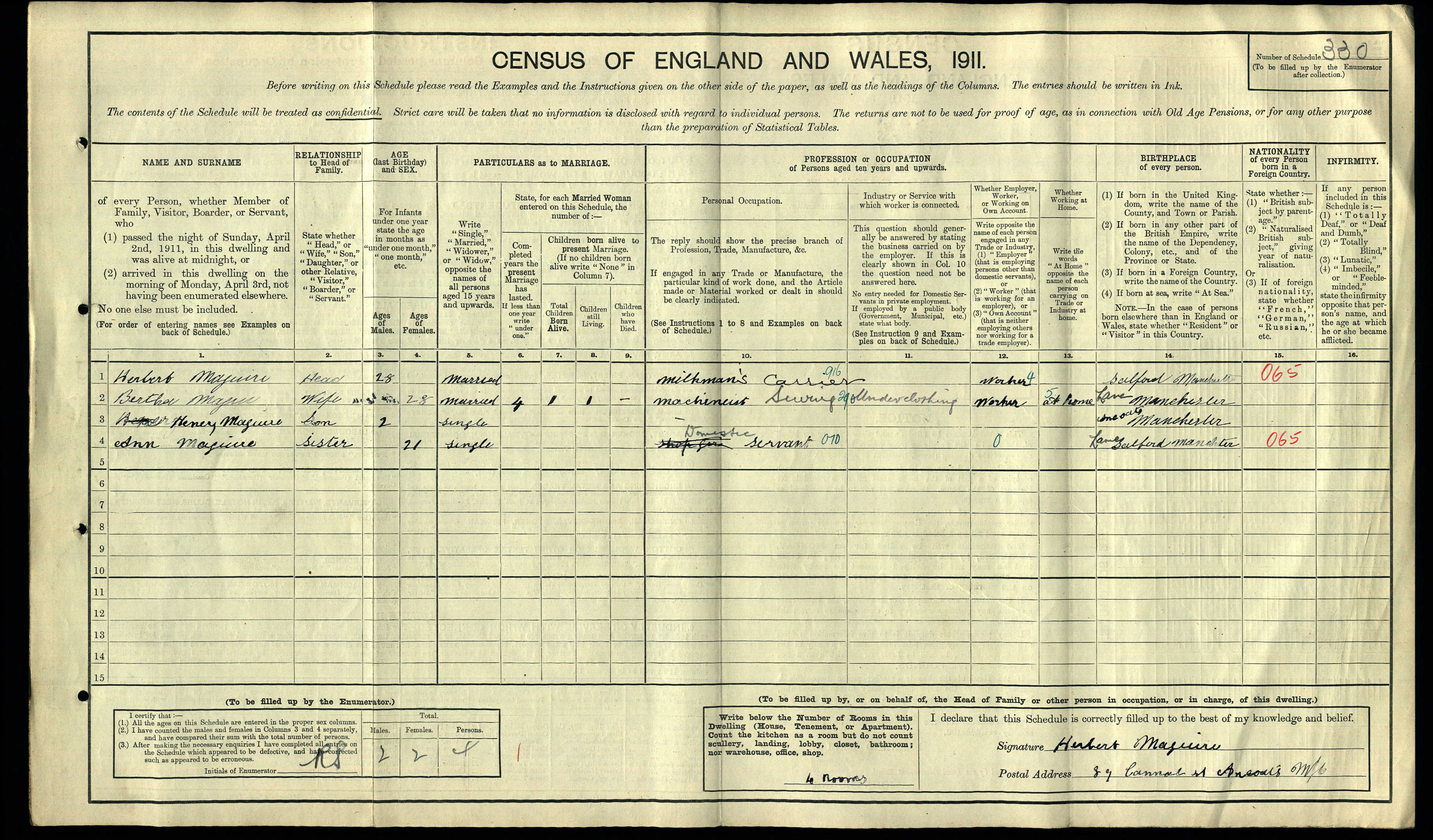 | 1911 | 89 Cannock Street, Ancoats, Manchester | Hubert | Head | 28 | Dairyman | |