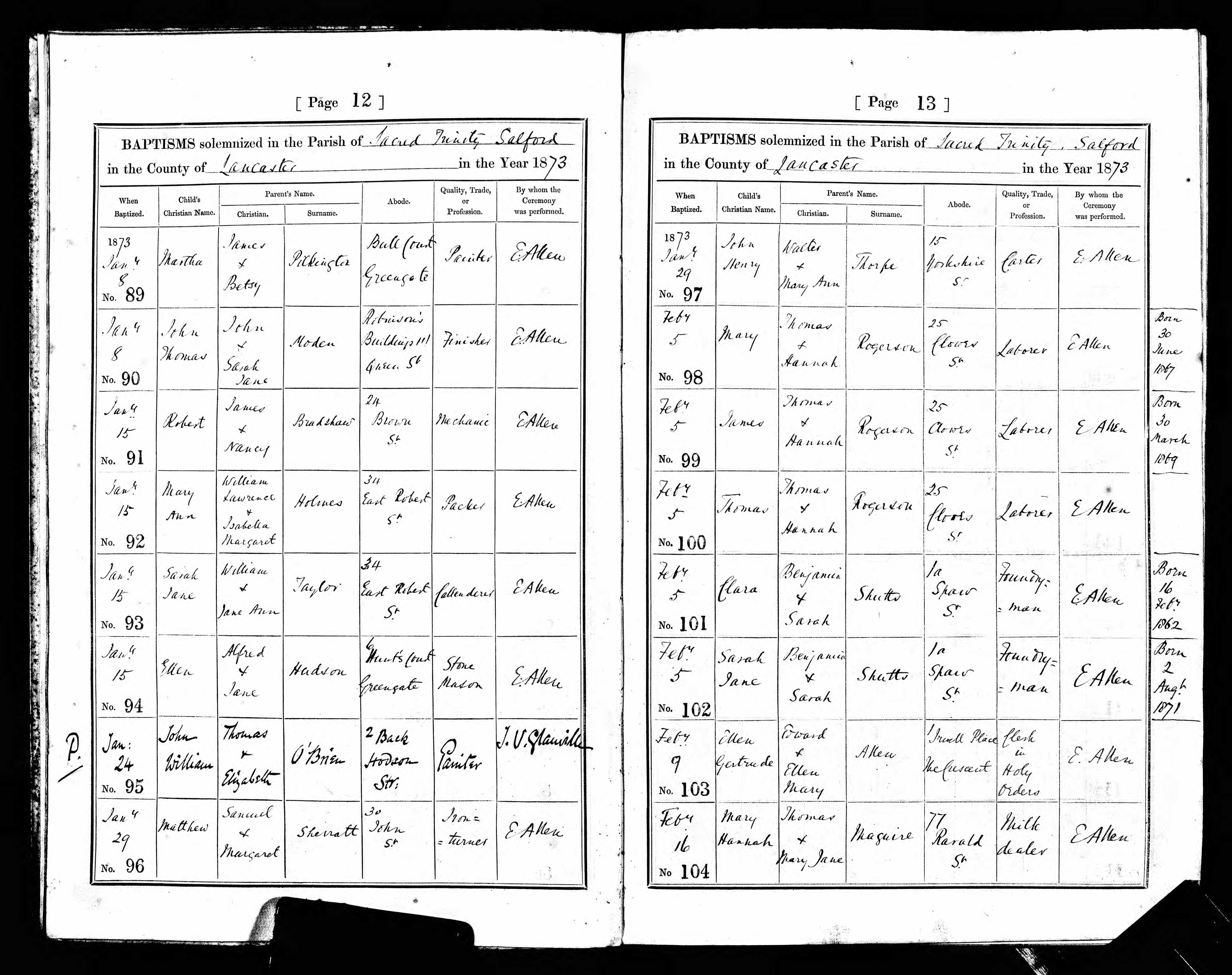 | Mary Hannah | 1872 | Salford | Sacred Trinity | x | x | x | x | x | x | x | x | Name | Date |