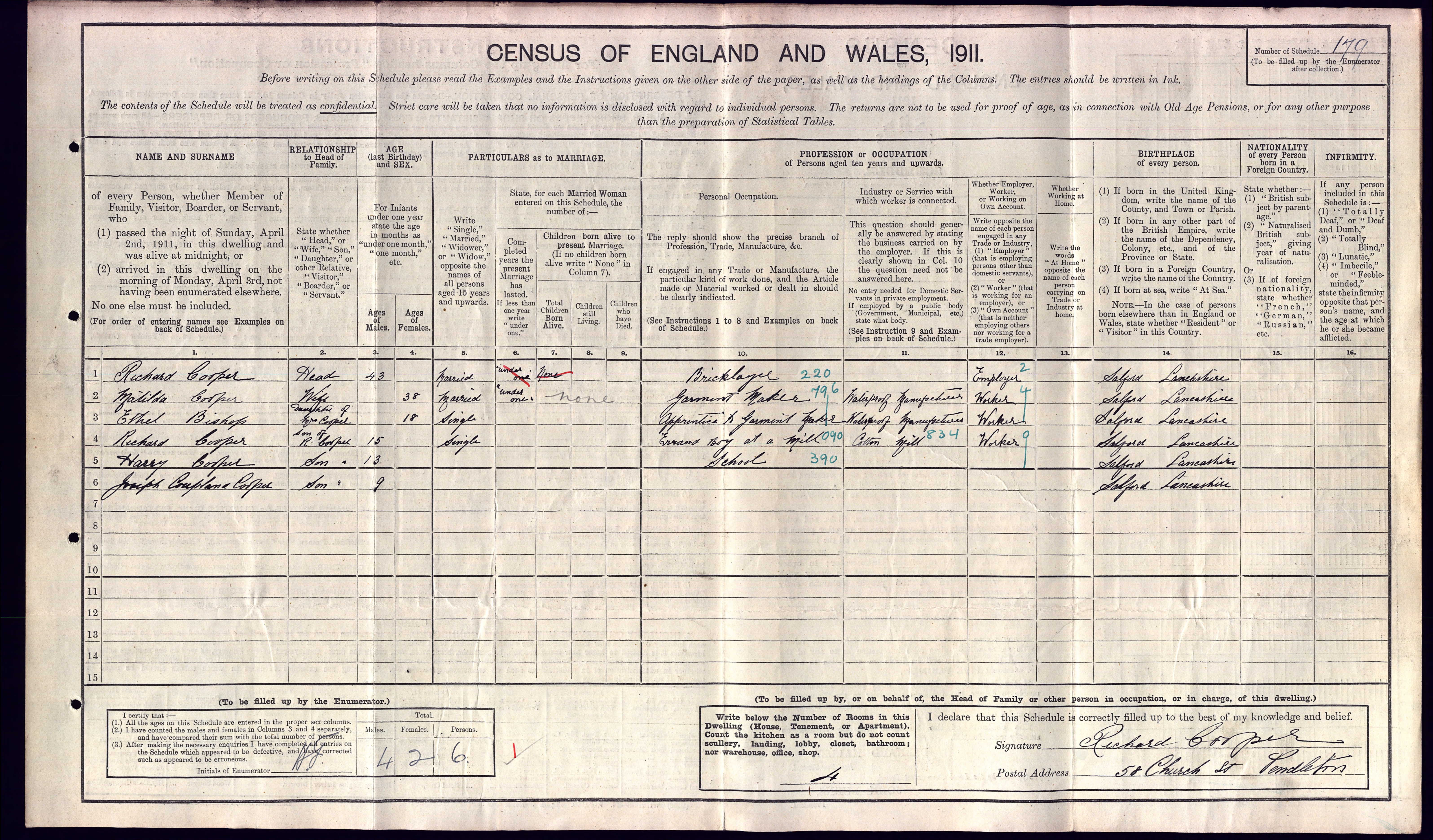 | 1911 | 58 Church St Pendleton | Richard Cooper | Wife | 43 | Bricklayer | |