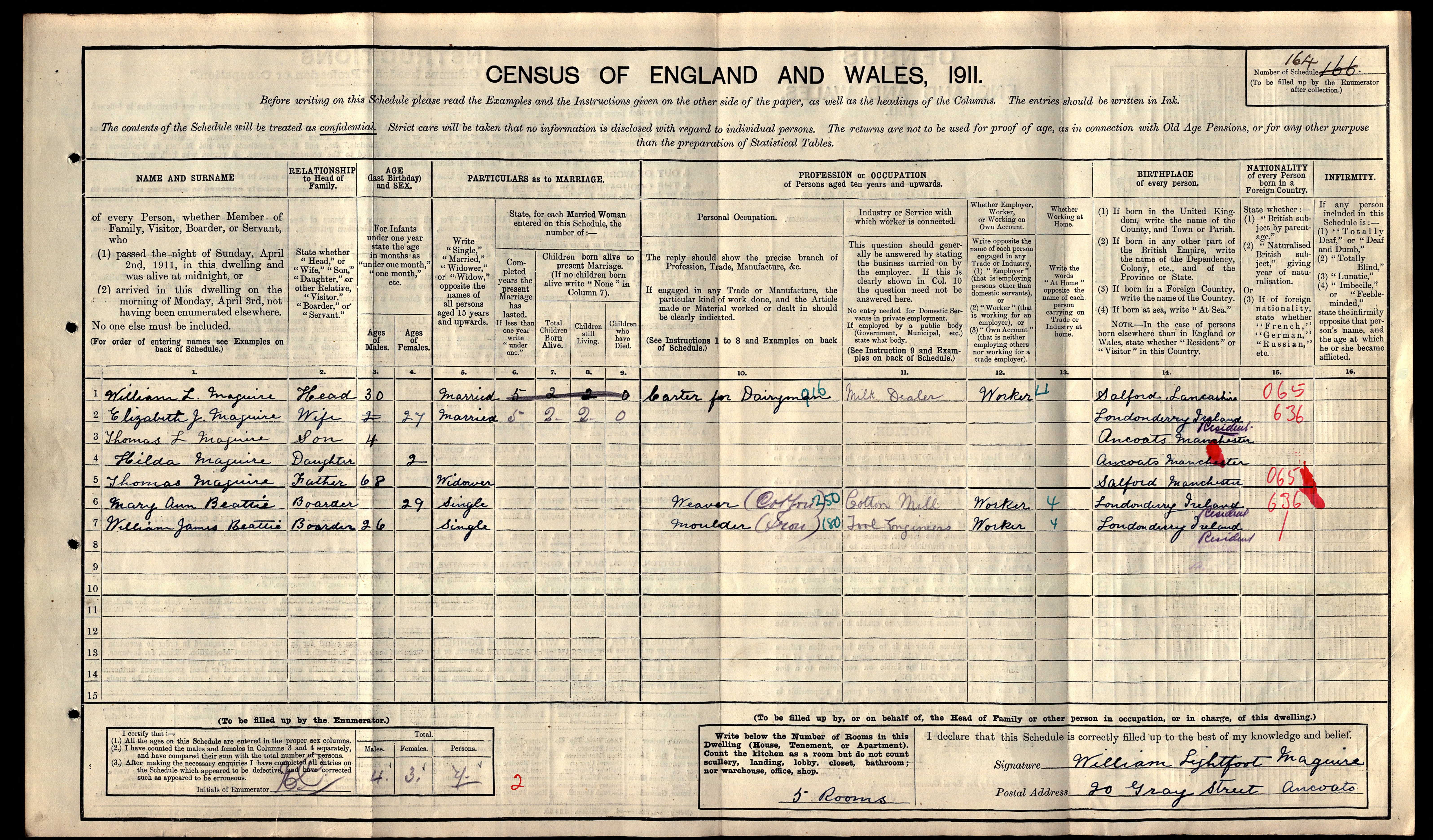 | MAGUIRE | William Lightfoot | Elizabeth Jane Beattie | 1880 | 1962 | Milk Dealer | 1880 | 1880 | 1962 | 1905 | x | x | x | x | 1881 | 1891 | x | 1911 | x | 1939 |